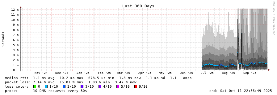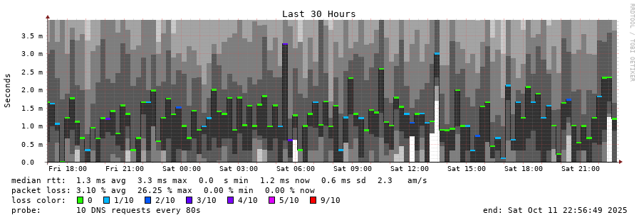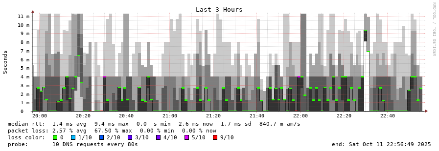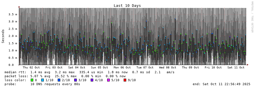 traceroute to 2620:fe::fe (2620:fe::fe), 30 hops max, 80 byte packets - Generated at 2025-10-11 22:45:01 3 > 4 > 2620:fe::fe (2620:fe::fe) [AS19281] 0.357ms 0.358ms 0.270ms