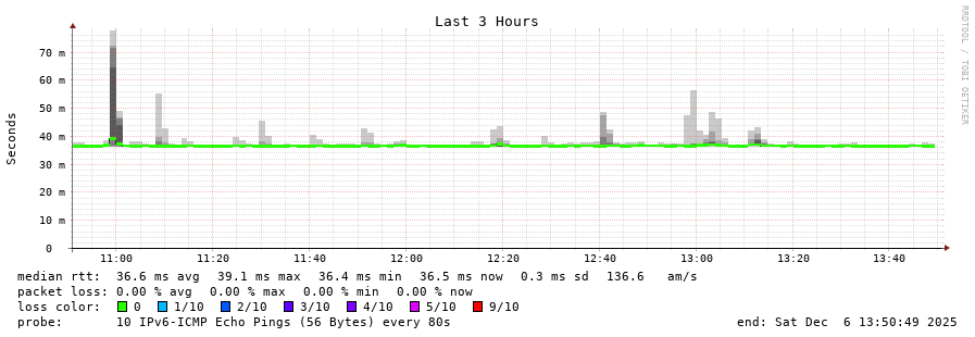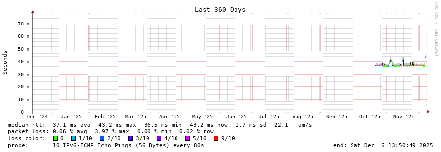 traceroute to 2001:67c:1e0:0:c225:e9ff:fea8:6a0a (2001:67c:1e0:0:c225:e9ff:fea8:6a0a), 30 hops max, 80 byte packets - Generated at 2025-12-06 13:45:01