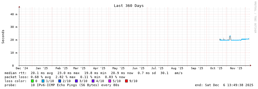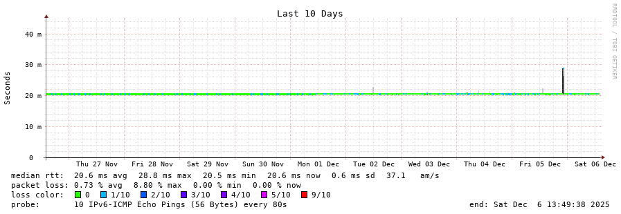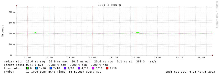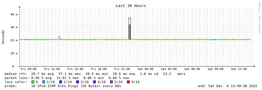 traceroute to 2a00:c30:bbbb:d::2 (2a00:c30:bbbb:d::2), 30 hops max, 80 byte packets - Generated at 2025-12-06 13:30:01