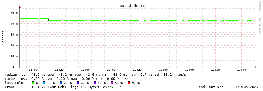 13 > 2001:67c:10:1102::11 (2001:67c:10:1102::11) [AS60149] 42.782ms 42.711ms 42.708ms