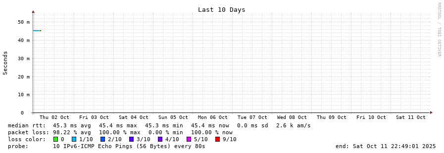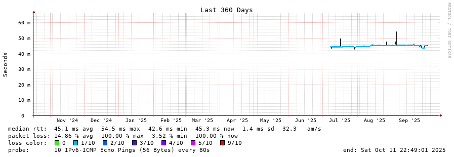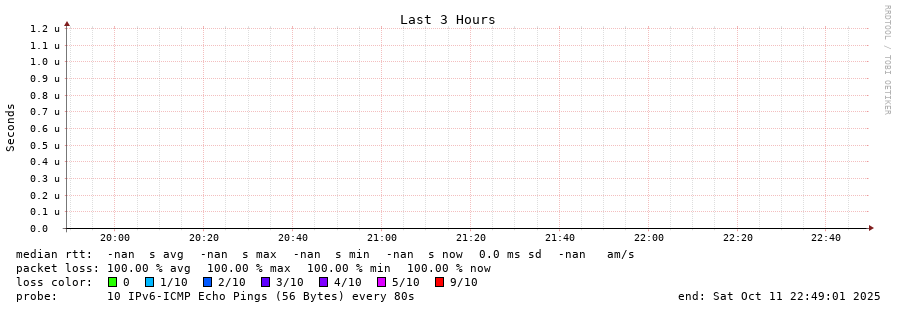 traceroute to 2a00:c560:c0c0:1a1a::9 (2a00:c560:c0c0:1a1a::9), 30 hops max, 80 byte packets - Generated at 2025-10-11 22:30:01