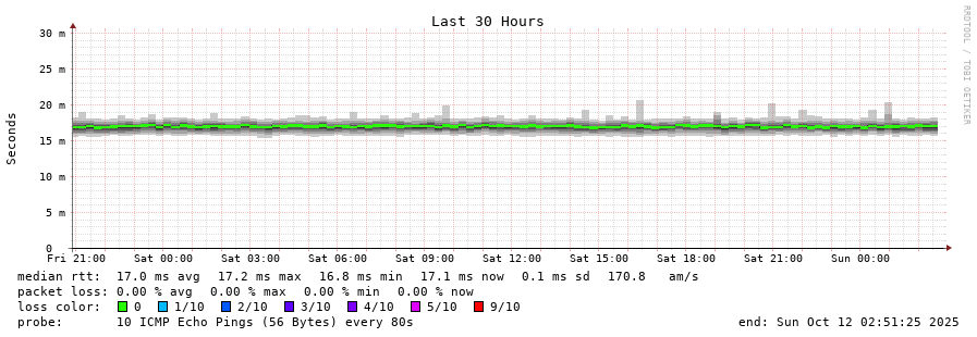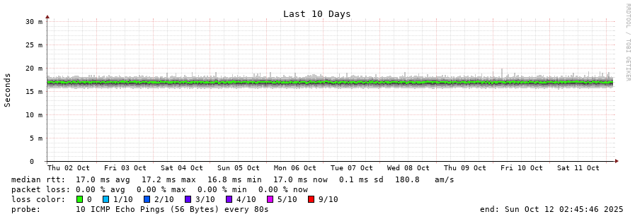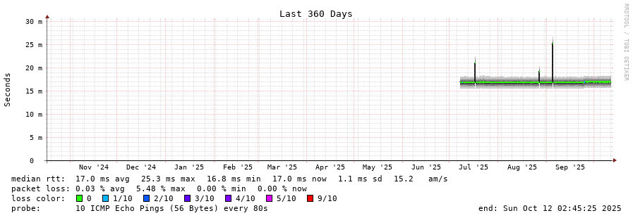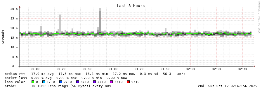 traceroute to 91.121.131.235 (91.121.131.235), 30 hops max, 60 byte packets - Generated at 2025-10-12 00:45:01 3 > 4 > 5 > 6 > zrh-zur1-pb1-8k.ch.eu (91.121.131.235) [AS16276] 17.131ms 17.307ms 16.280ms